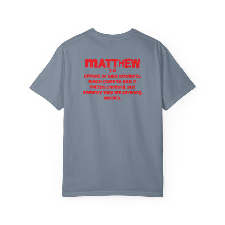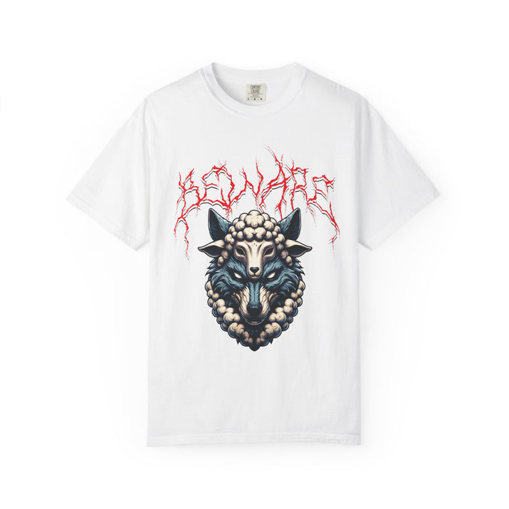 Beware of wolves short sleeve unique Christian t-shirt, cool faith tee, mens rocker spiritual shirt, bible scripture word of God tee