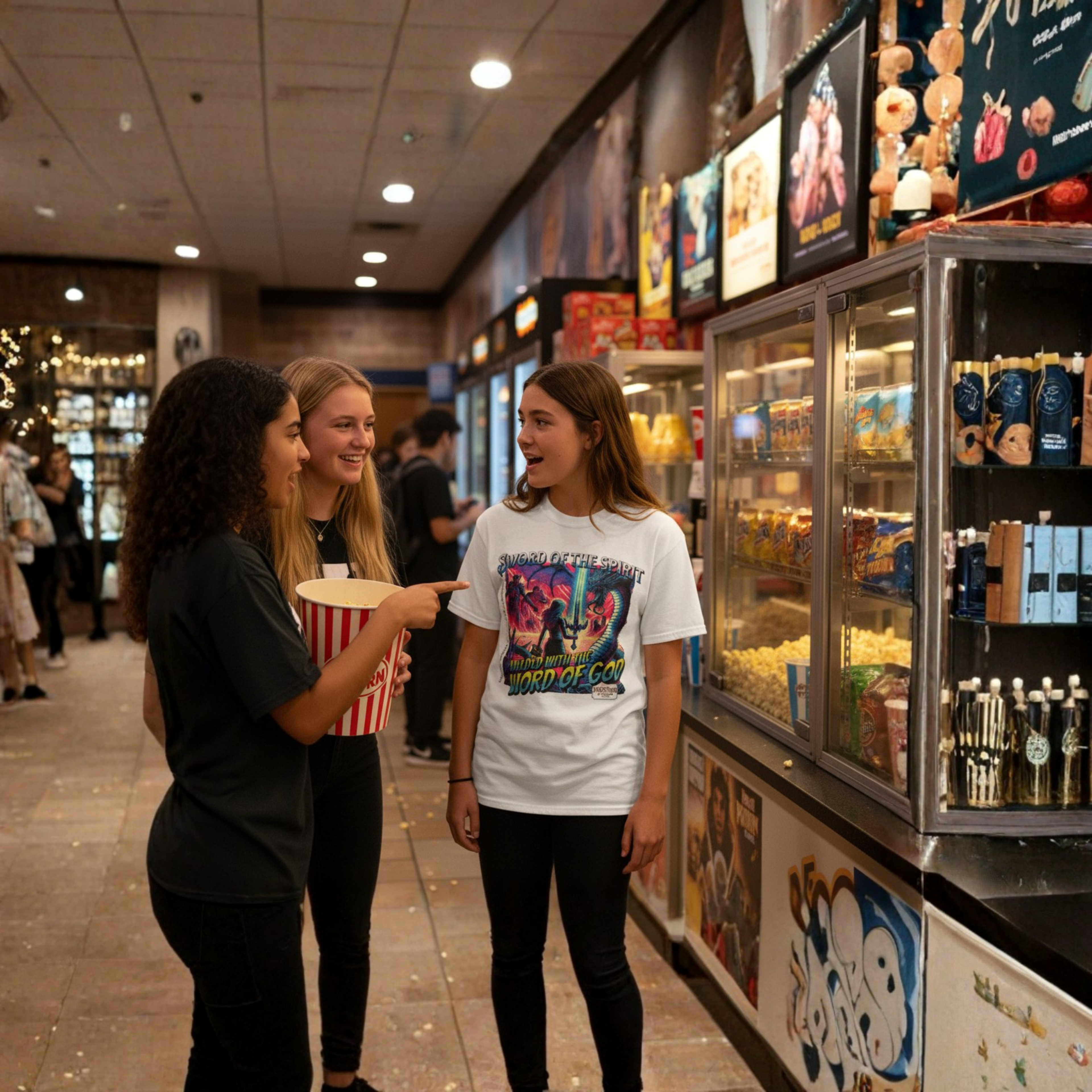 Jaylen then proceeds to share the Gospel of Jesus Christ and leads her to the Lord right there in the popcorn line that night, all because of the catchy visual of her Sword of the Spirit shirt that sparked just enough of a conversation, allowing her to speak out about her faith. Holy Spirit used Jaylen to add one more precious soul to the Kingdom of God and share the love of Christ!