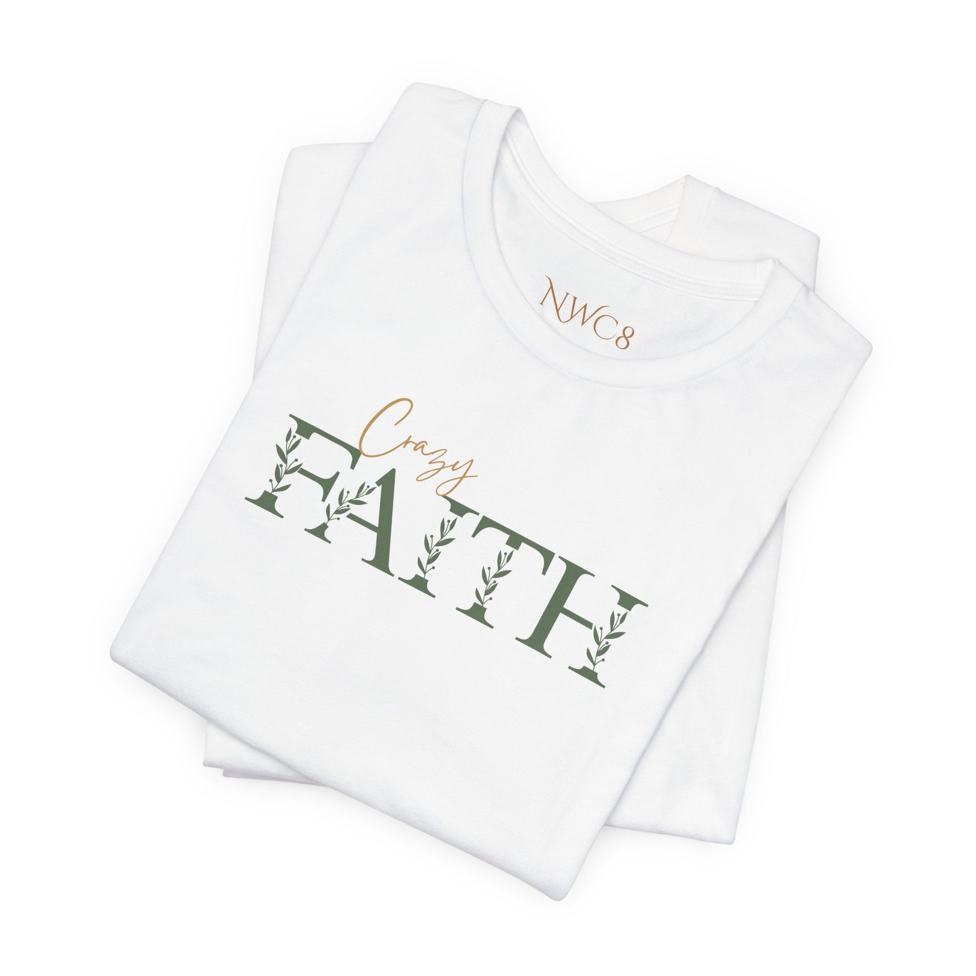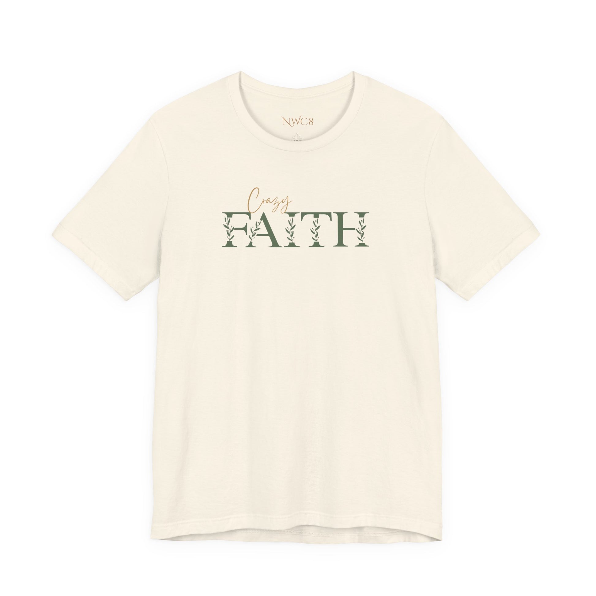 This beautifully designed tee features elegant botanical lettering that spells out "Crazy Faith" in soft olive green with delicate vines woven through each letter. It's a reminder that the kind of faith God calls us to isn't safe, predictable, or logical—it's wild, bold, and completely dependent on Him.