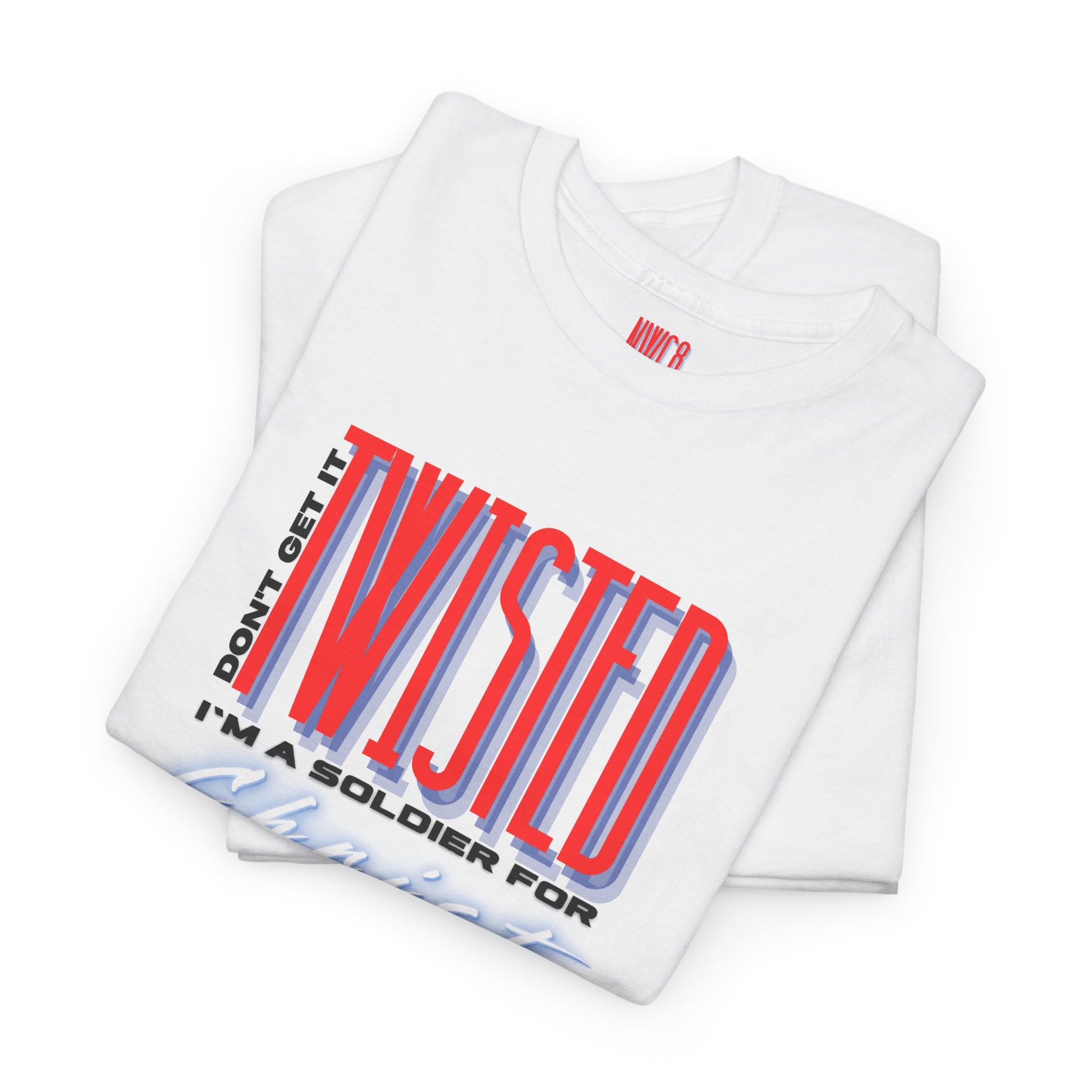 This bold design features the phrases "DON'T GET IT" above,the word "TWISTED" in large red and blue 3D lettering with and "I'M A SOLDIER FOR CHRIST" below in a modern, edgy style. It's a declaration that cuts through the noise and makes your allegiance crystal clear.