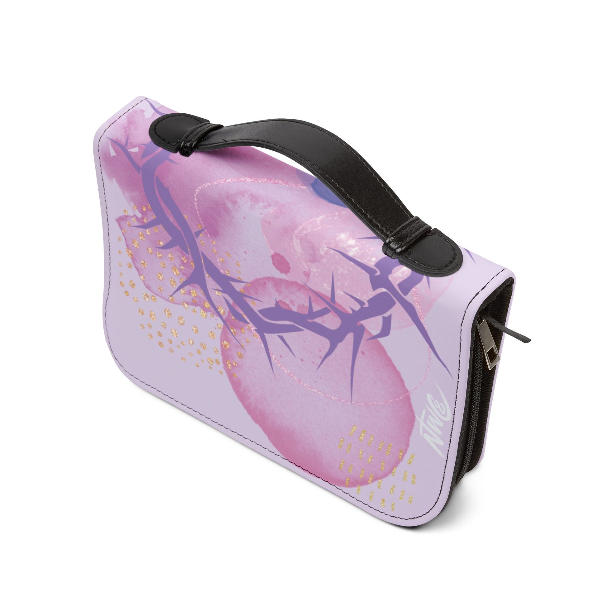 This stunning Bible cover captures the beautiful paradox of the Gospel through soft watercolor artistry. Delicate purple and pink watercolor washes blend together like a dreamy sunset, while a purple crown of thorns silhouette wraps around the design. Gold metallic speckles scattered throughout add an elegant, celestial touch, symbolizing the glory that came through suffering.