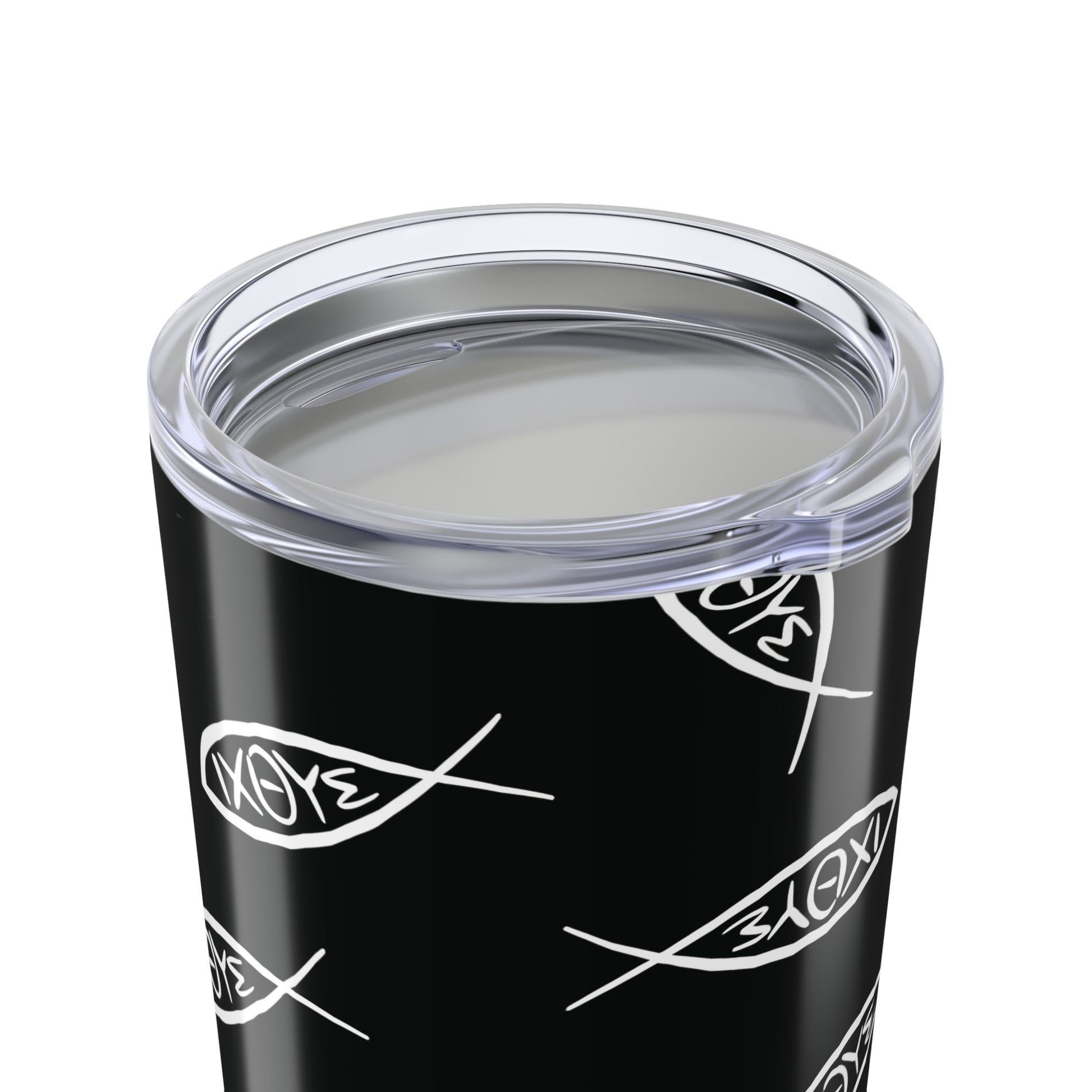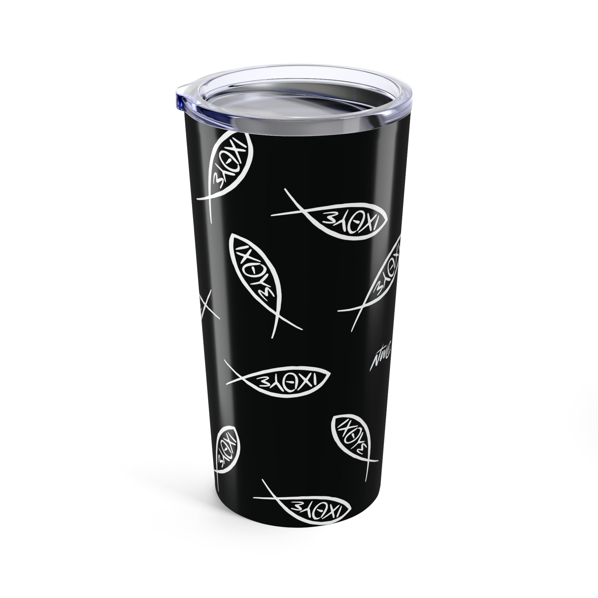 This beautifully designed tumbler features a sleek black background with white Ichthys fish symbols scattered across the surface in various sizes and orientations. Each fish contains the Greek letters ΙΧΘΥΣ inside, creating a modern, minimalist pattern that honors the ancient symbol.