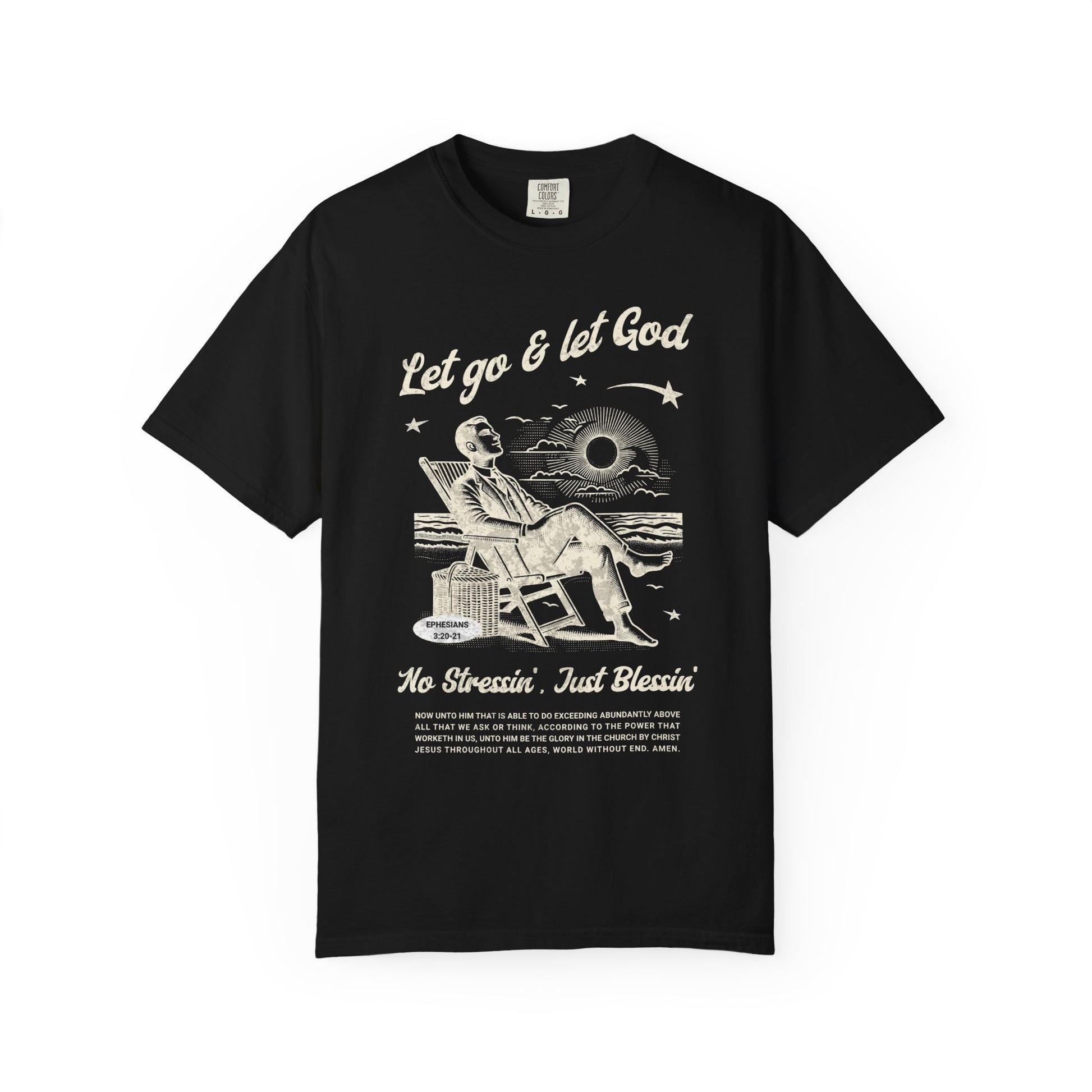 Featuring a serene illustration of someone resting in a beach chair under the sun with the words "No Stressin', Just Blessin'" and Ephesians 3:20-21 at the bottom, this tee is a wearable reminder that God's got this.