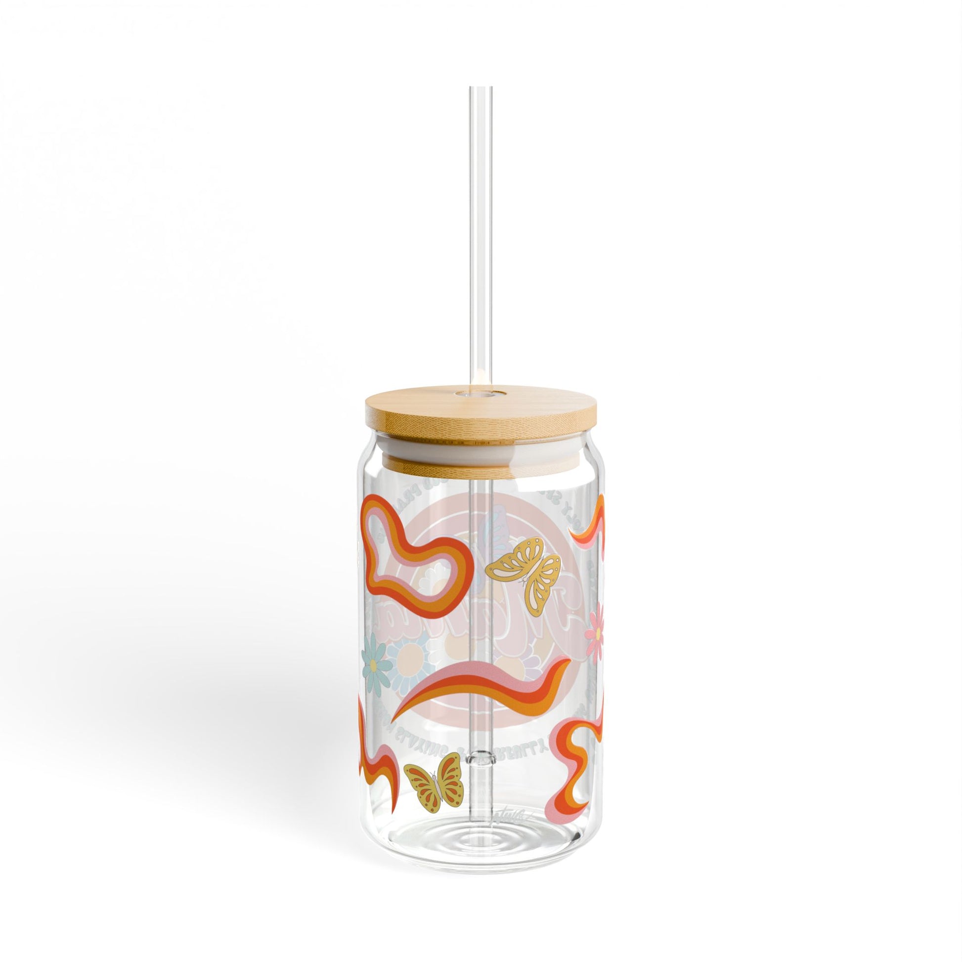 This beautiful glass tumbler features vibrant retro-style flowers and butterflies in orange, yellow, pink, and blue surrounding the bold declaration: