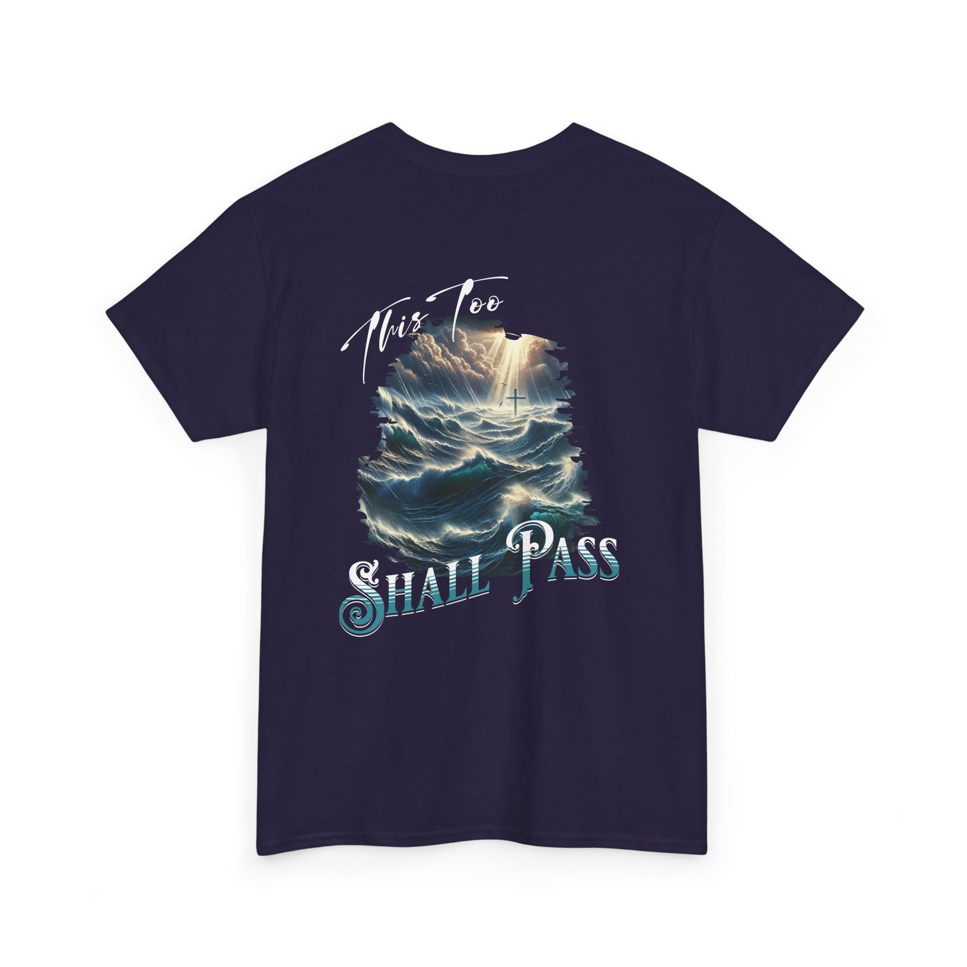 This stunning design beautifully captures that promise with a breathtaking scene of turbulent ocean waves, dramatic storm clouds parting to reveal heaven's light, and a solitary cross standing firm in the midst of the chaos. The words "This Too" appear in elegant script at the top, while "SHALL PASS" anchors the bottom in bold, ornate lettering—a visual reminder that even when life feels like you're drowning, Jesus is your anchor.